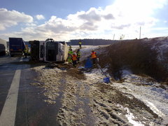 | Augsburg/Friedberg, 13.12.2010. Schnee und spiegelglatte Fahrbahnen sorgten in den Morgenstunden für eine Vielzahl von Unfällen auf den Straßen in und um Augsburg. Darunter auch ein LKW, der auf der BAB 8 bei km 32,5 zwischen Dasing und Adelzhausen von der Fahrbahn kam und direkt in die Böschung fuhr. Durch die Wucht des Aufpralls drehte sich der LKW samt Hänger um 180 Grad und blieb auf der Seite liegen. Zur Bergung des LKW war der OV Friedberg alarmiert worden, da die teils aus schweren Maschinenteilen, Blechen und massiven Metallrohren bestehende Ladung vorher auf einen bereitstehenden Sattelschlepper umgeladen werden musste. Vor Ort stellte sich heraus, das das Umladen der schweren Teile größtenteils nur von Hand durchführbar ist und somit weitere Helfer nötig waren. Gegen 11:05 wurde der OV Augsburg zur Unterstützung der Friedberger Kameraden alarmiert, worauf weitere 14 Helfer sofort zur Verfügung standen. Um 14:30 Uhr rückte unsere Mannschaft wieder von der Unfallstelle ab und beendete den Einsatz für den OV Augsburg. Lediglich zur Bergung der schweren Metallrohre war unser Kipper mit Ladekran noch bis 17:05 Uhr im Einsatz.